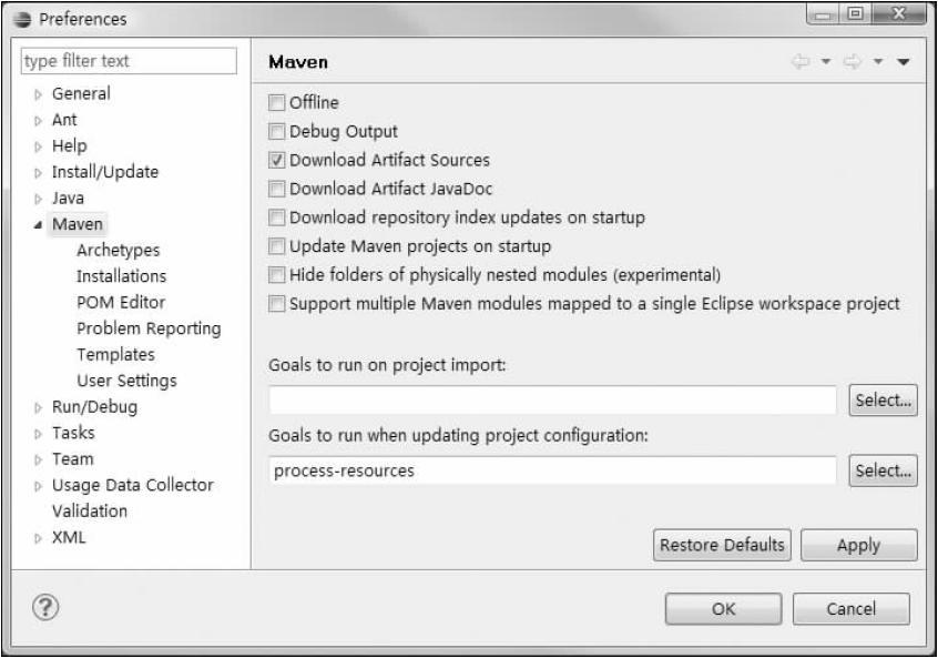m2eclipse用户可以在项目上或者pom.xml上右击,选择Maven,再选择Download Sources让m2eclipse为当前项目的依赖下载源码包。也可以设置Maven首选项让m2eclipse默认自动下载源码包。方法是单击Eclipse菜单中的Window并选择Preferences,然后在弹出的对话框左边选择Maven,接着在右边选上Download Artifact Sources,如图16-27所示。