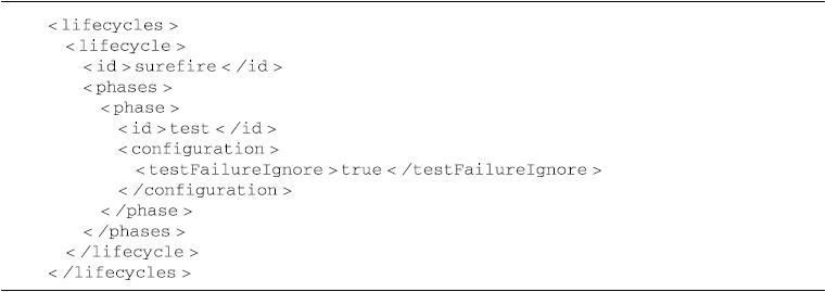 在运行该目标之前让Maven先运行一个自定义的生命周期,到指定的阶段为止。例如maven-surefire-report-plugin这个用来生成测试报告的插件,它有一个report目标,标注了@execute phase="test"lifecycle="surefire",表示运行这个自定义的surefire声明周期至test阶段。自定义生命周期的配置文件位于src/main/resources/META-INF/maven/lifecycle.xml。内容如代码清单17-5所示。