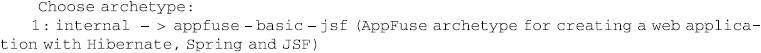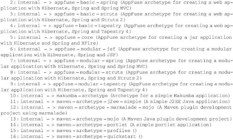 这个列表来自于名为archetype-catalog.xml的文件,18.3节将对其进行深入解释。现在,用户需要选择自己想要使用的Archetype,然后输入其对应的编号。