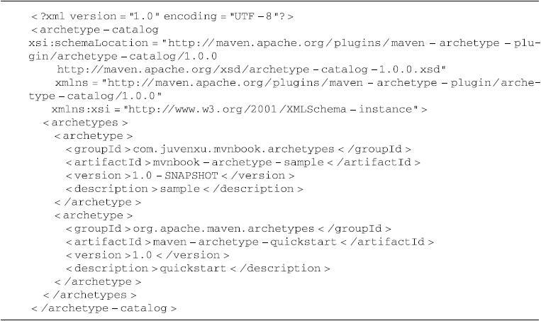 上述archetype-catalog.xml包含的两个Archetype读者应该已经熟悉了,第一个Archetype的坐标是com.juvenxu.mvnbook.archetypes:mvnbook-archetype-sample:1.0-SNAPSHOT,也就是上一节自定义的Archetype;第二个则是maven-archetype-plugin默认使用的Quickstart Archetype。这个XML非常简单,它主要包含了各个Archetype的坐标。这样,当用户选择使用某个Archetype的时候,Maven就能够立刻定位到Archetype构件。