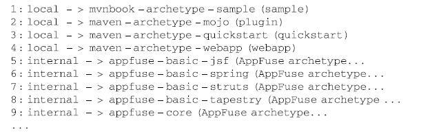 ·remote:指向了Maven中央仓库的Archetype Catalog,其确切的地址为http://repo1.maven.org/maven2/archetype-Catalog.xml。在本书编写的时候,该Catalog包含了约249个Archetype信息。