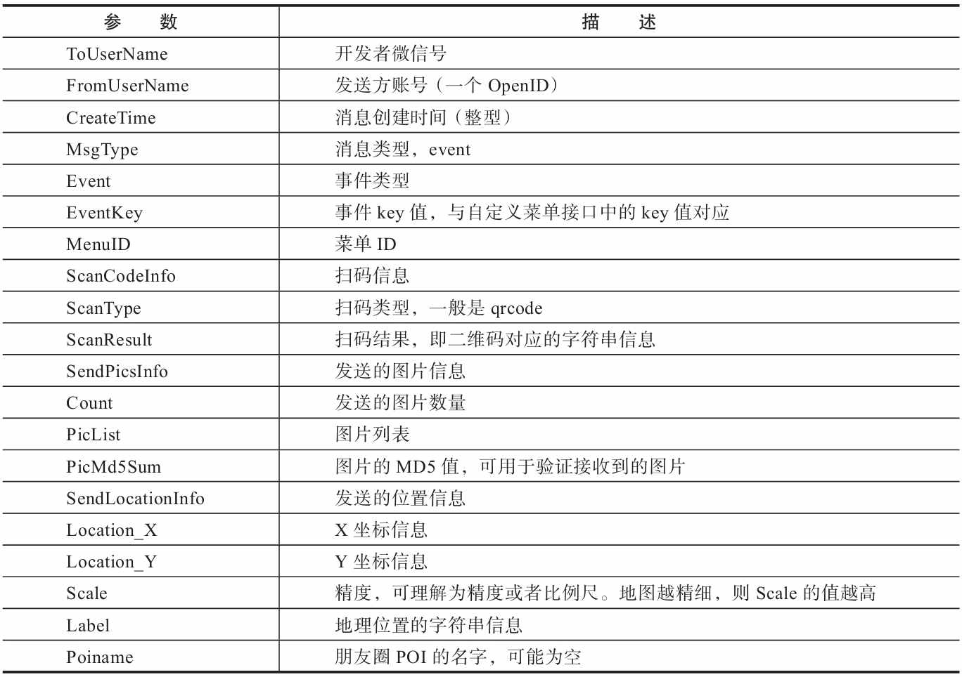 用户点击菜单之后,微信会将事件推送给接口程序,相应的参数及说明如表5-5所示。
