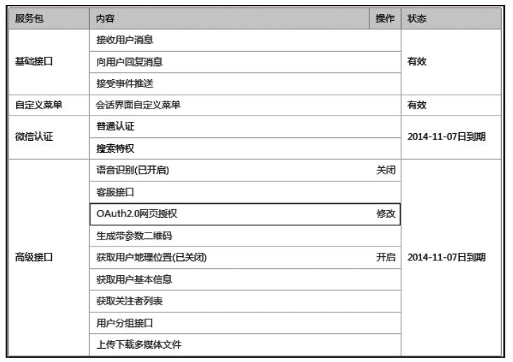 在高级接口权限列表中,找到“OAuth2.0网页授权”,点击右侧的“修改”,如图7-2所示。