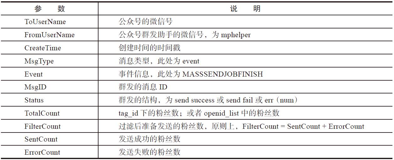 由于群发任务提交后,群发任务可能在一定时间后才完成,因此群发接口调用时,仅会给出群发任务是否提交成功的提示。若群发任务提交成功,则在群发任务结束时会向开发者在公众平台填写的开发者URL(callback URL)推送事件。