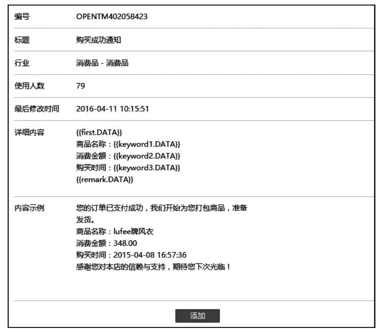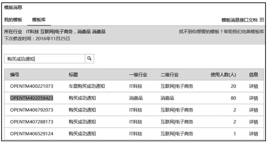 在“模板库”的搜索框中搜索“购买成功通知”,将检索出标题为“购买成功通知”的模板列表,如图10-32所示。