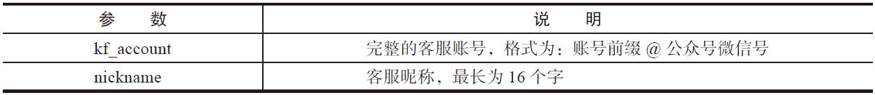 设置客服信息的接口如下。 https:// api.weixin.qq.com/customservice/kfaccount/update?access_token=ACCESS_TOKEN 设置客服信息时,POST数据示例如下。 { "kf_account":"test1@test", "nickname":"客服1" } 上述数据的参数说明如表11-7所示。 表11-7 设置客服信息的参数说明 正确创建时,返回的数据示例如下。 {"errcode":0,"errmsg":"ok"}