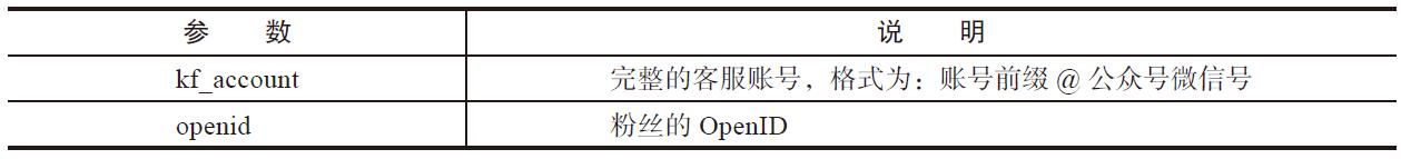 关闭会话的接口如下。 https:// api.weixin.qq.com/customservice/kfsession/close?access_token=ACCESS_TOKEN 关闭会话时,POST数据的格式如下。 { "kf_account":"test1@test", "openid":"OPENID" } 上述数据的参数说明如表11-11所示。 表11-11 关闭会话接口的参数说明 正确创建时,返回的数据示例如下。 {"errcode":0,"errmsg":"ok"}
