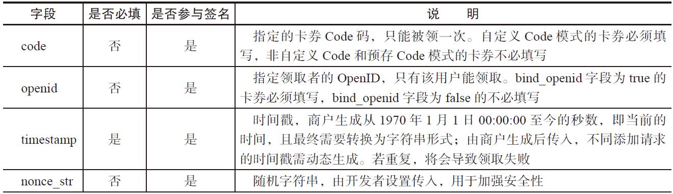 添加卡券时,需要填写cardExt。cardExt本身是一个JSON字符串,是商户为该卡券分配的唯一性信息,包含的字段如表14-1所示。