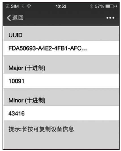点击“详情”链接,可以看到该设备ID的详情,包括UUID、Major、Minor等3个参数,如图19-4所示。后面进行设备配置时,将需要用到这3个参数。