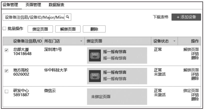登录微信公众平台后台,依次进入“功能”|“摇一摇周边”|“设备管理”。在设备列表中,选择要绑定页面的设备,如图19-24所示。