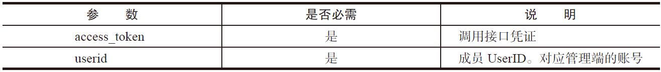 删除成员的接口如下。 https:// qyapi.weixin.qq.com/cgi-bin/user/delete?access_token=ACCESS_TOKEN&userid=USERID 上述接口的参数说明如表20-12所示。 表20-12 删除成员接口的参数说明 正确提交时,返回的数据示例如下。 { "errcode":0, "errmsg":"deleted" }