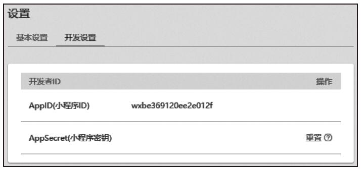 21.1.1 AppID 在微信公众平台官网(https://mp.weixin.qq.com)输入小程序的账号和密码登录以后,就可以在网站的“设置”|“开发设置”中查看微信小程序的AppID了,如图21-1所示。 图21-1 小程序AppID