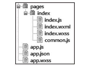 项目文件列表如图21-9所示,程序只有一个页面index,该页面有相应的.js、.wxml、.wxss文件。另外,它还有一个公共模块common.js,用于获取外部数据。
