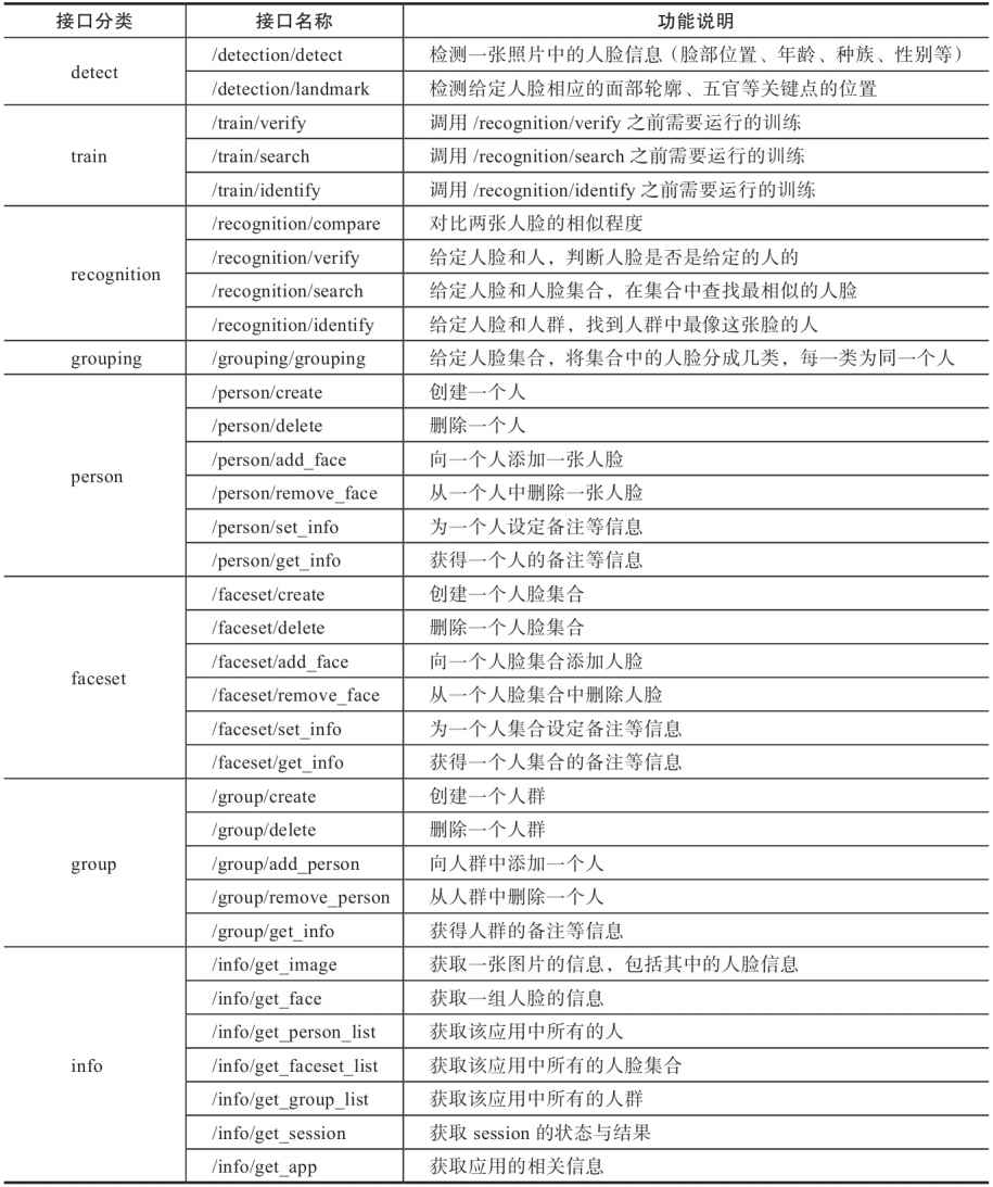 Face++接口的功能包括:人脸检测与分析、训练模型、人脸识别、人脸聚类与分组、Person管理、FaceSet管理、Group管理、信息查询。开发者可以使用这些接口开发出更多有趣的人脸相关的应用。接口列表如表24-3所示。
