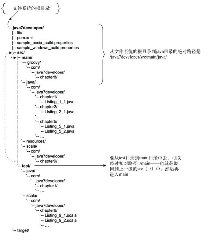 反之亦然,你的程序可能一直运行在同一位置,比如图2-1中的target目录。但目录树的根目录可能会变,比如从/java7developer变成了D:workspacej7d。这时就不能依靠绝对路径,而要用相对路径转到你想到达的位置。