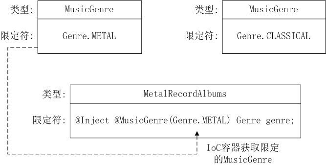 为了让你对上面的规则有直观的感受,下面给出一个@Qualifier实现。某音乐库框架中的IoC容器提供了一个限定符@MusicGenre,开发人员在创建MetalRecordAlbumns类时可以使用该限定符,以确保注入了正确的Genre。