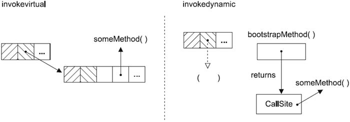 在Java 7中,Java语言还不能直接支持invokedynamic,没有哪个Java表达式会被javac直接编译成invokedynamic。人们希望Java 8会增加更多的语言结构(比如默认方法)来使用这些动态能力。