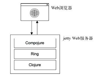 如图13-6所示,Compojure构建在Ring框架之上,Ring框架是Clojure连接到Jetty Web容器的中间件。但使用Compojure/Ring并不需要对Jetty有多深入的了解。我们先用一个简单的Hello World作为Compojure的入门应用吧。