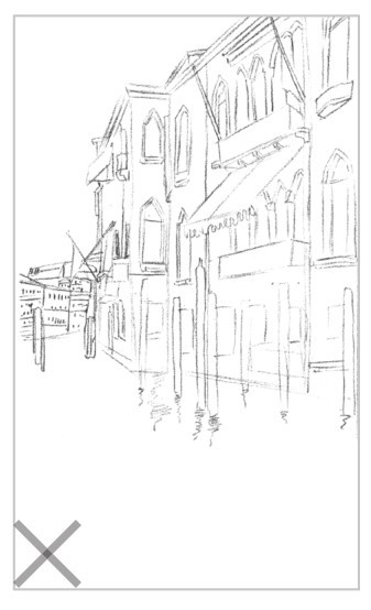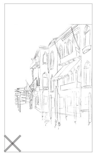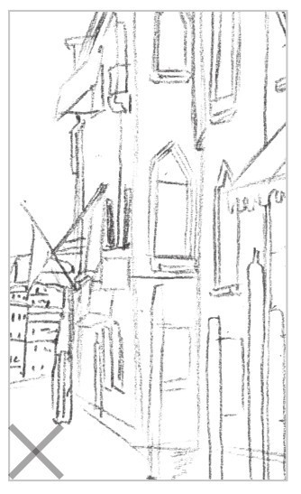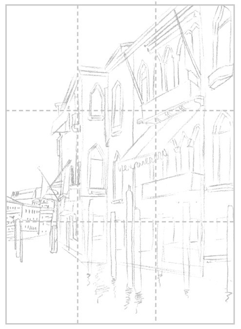初学者构图时,常常出现构图偏上、偏下、偏大或偏小等画面不均衡的错误。我们可以使用九宫格的方式(如左图所示)对画纸进行均等的分割,将对象合理地安排在画纸中。