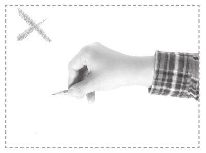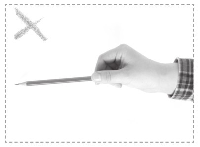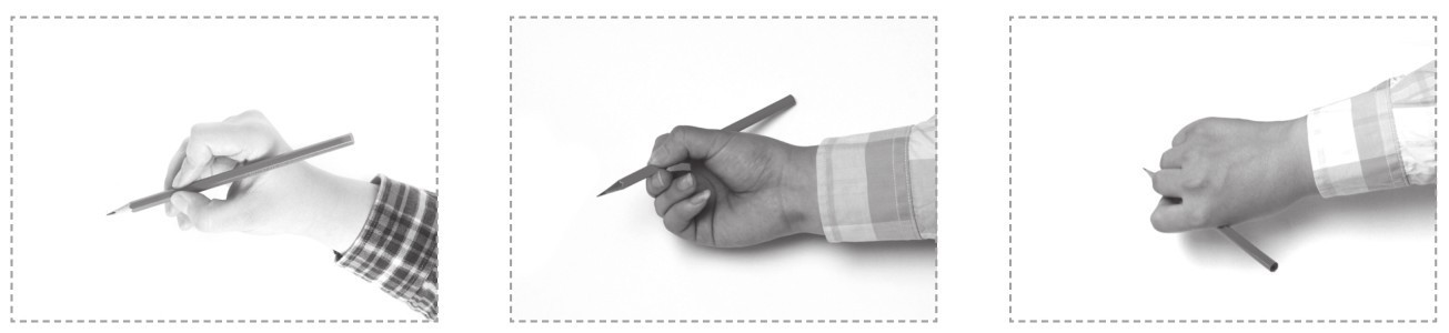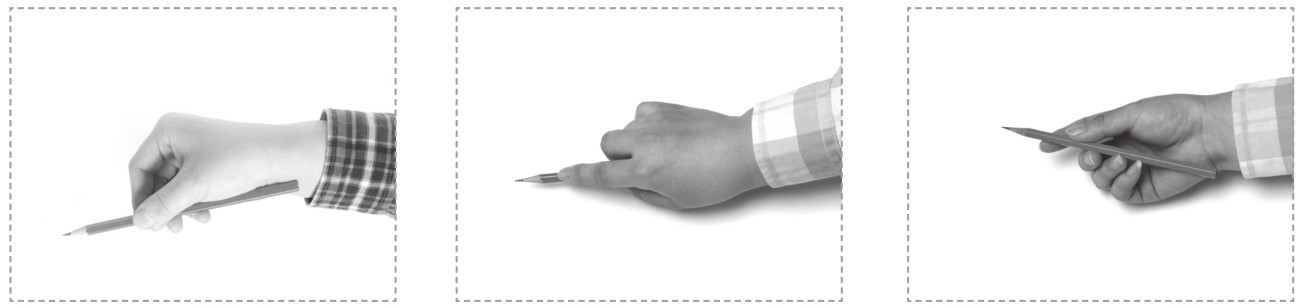 食指与拇指的端部轻捏笔杆,离笔尖约3厘米,中指的第一指节处顶住笔杆,无名指和小拇指自然弯曲,垫于下端。笔杆上部靠在食指根部的关节处。笔杆与画纸保持45°至50°的夹角。