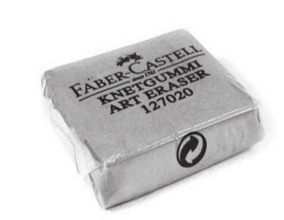 可塑橡皮比普通橡皮柔软,可以根据画面的需要,用手搓揉、按压、挤捏成不同的造型进行使用,还可以使黑、白、灰色调过渡得更加自然。
