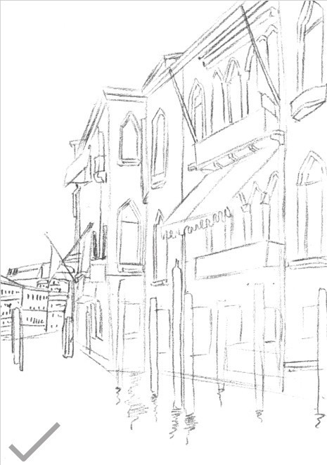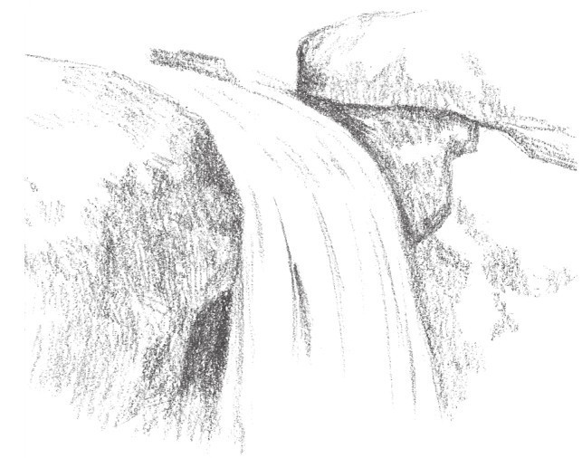 在风景画中,水一般不用刻意去绘制,通常是加深对周围山石和树木的刻画,水的形态就会自然凸显出来。山石间的流水要注意水的流动方向与水的源头。运笔要流畅灵巧,线条要虚实结合,有断有续地进行刻画。