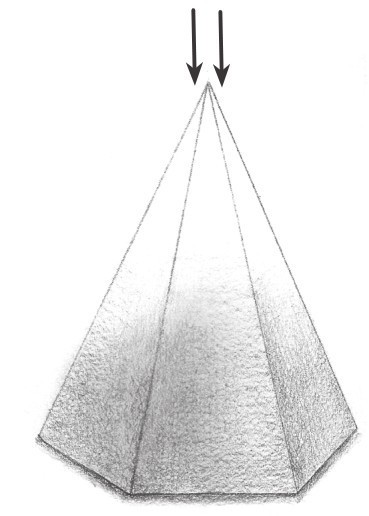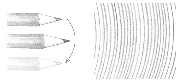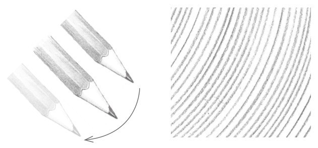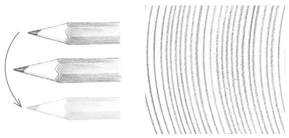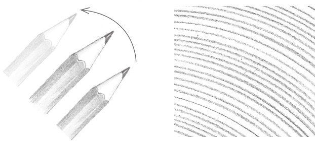画素描一般不用平常写字的执笔方法,而用铅笔置于掌下的横握执笔方法。通过腕力与肘力的发挥,画出的线条平直、流畅,显得格外有力。绘画中常常需要通过握笔杆的不同位置来改变笔触力度,笔杆握得越高,越好画出长而淡的线条;笔杆握得越低,越好画出短而深的线条。