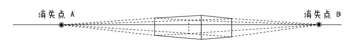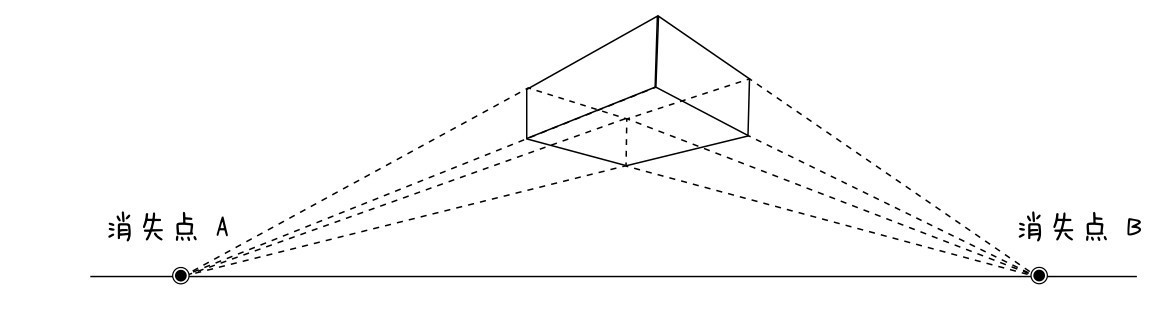 成角透视也叫“两点透视”,即物体向视平线的某两点消失。两点透视法是指视平线上有两个消失点,所绘制的立体结构(如下图所示)有两个消失点,两个面都用斜线绘制,强调了进深感。
