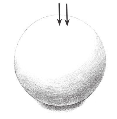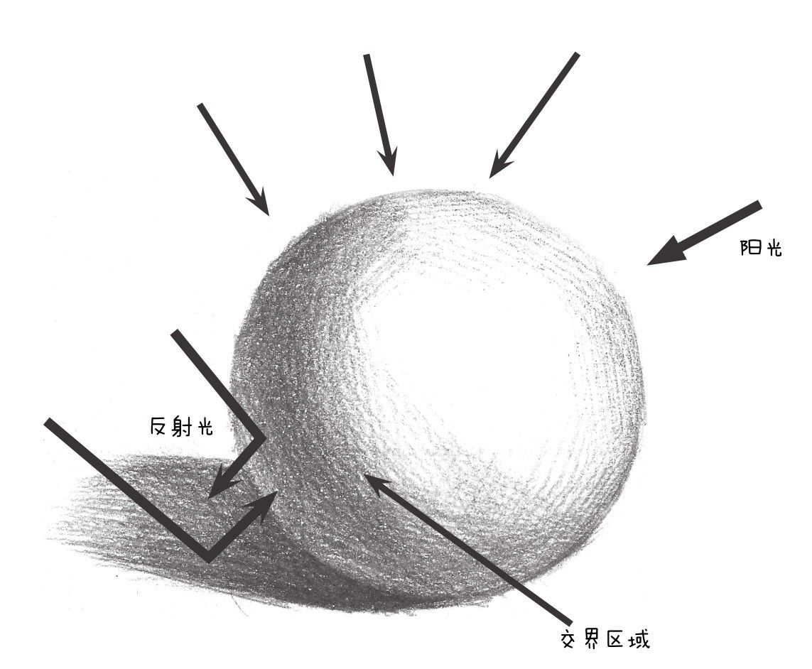 在学习和表现物体的体积之前,我们必须对光影的形成以及原理有一个基本的掌握与了解。光影主要是通过光照的角度和物体本身的颜色来体现的(如下图)。日常生活中,最为常见的光是太阳光。此外,还有人为的照明灯光。