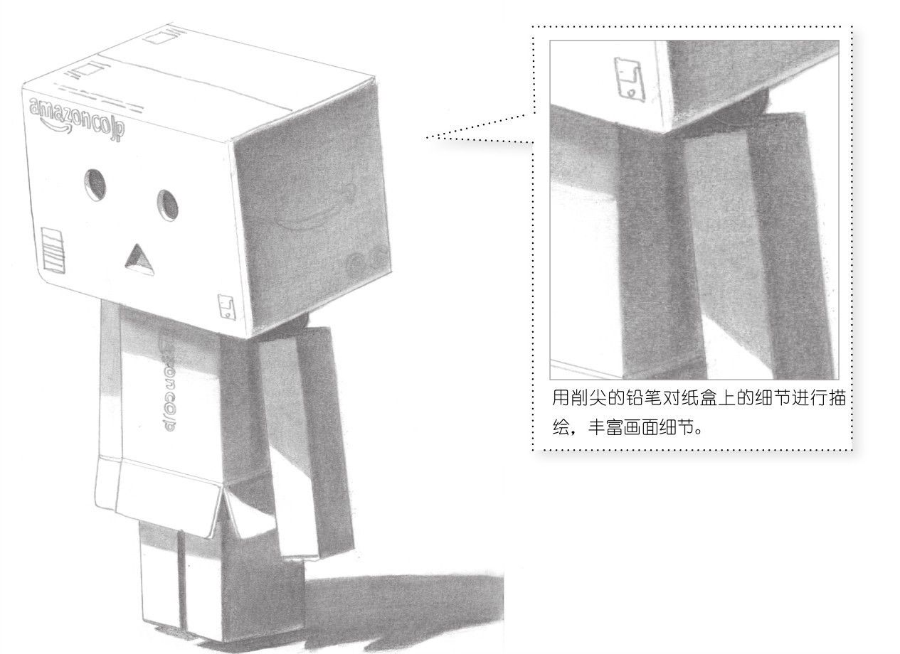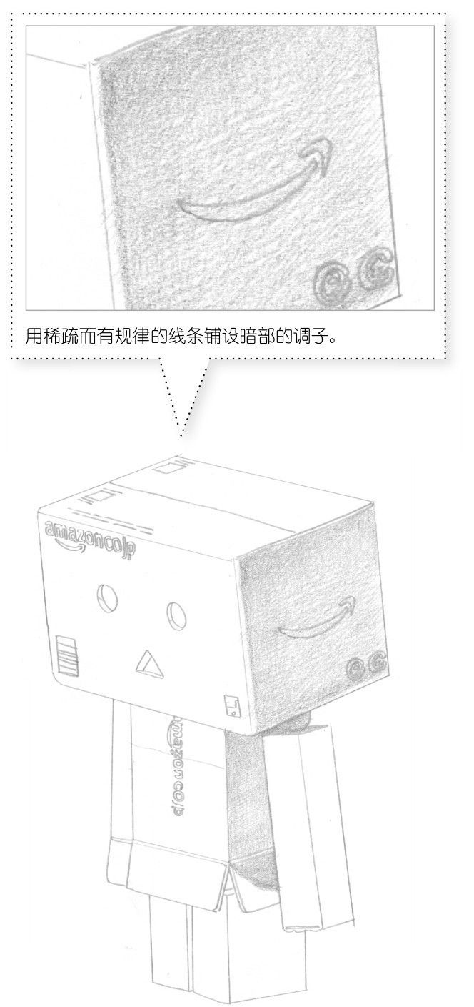 3 用简单的线条铺设出纸盒公仔头部和身体暗部的调子。