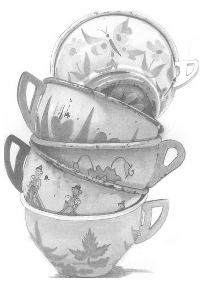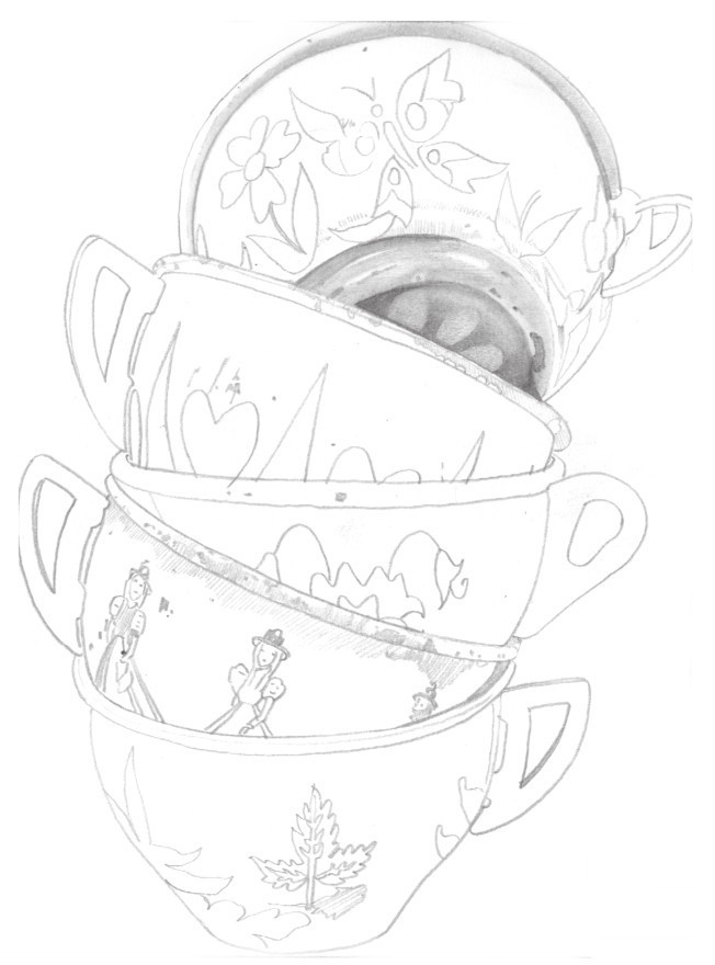 将大小、形体相同的茶杯上下层叠地摆放,形成了别致的造型。刻画时要把握好各个茶杯的形体样式以及茶杯之间的位置关系。
