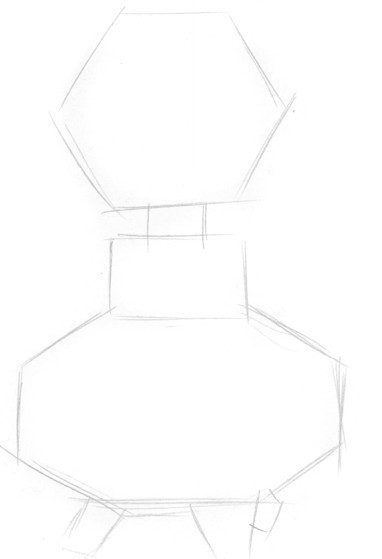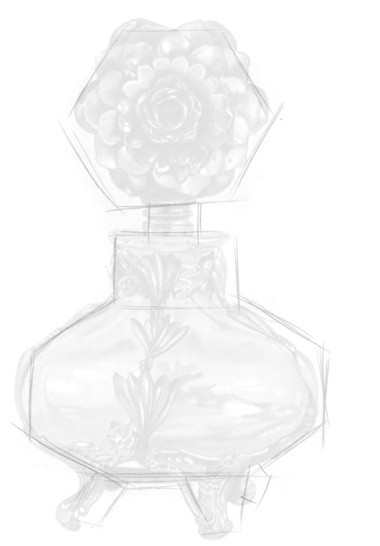1 观察香水瓶瓶身与顶部装饰物的比例,用较硬的铅笔简单地勾勒出香水瓶的轮廓。