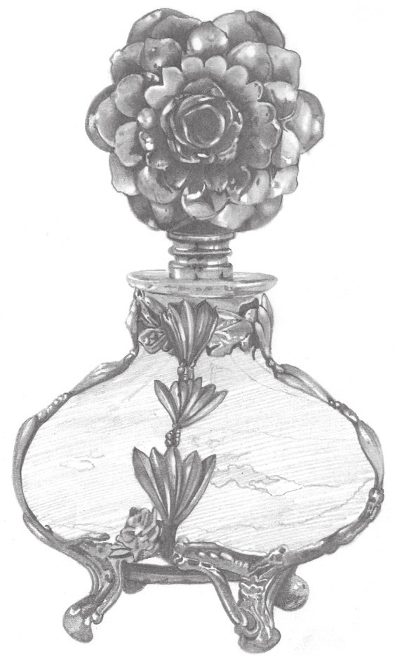 复古香水瓶造型独特,瓶口有漂亮的花朵装饰,瓶身上还有精致的花边装饰。刻画时要细致地画出装饰细节的造型图案,增强画面的表现力。