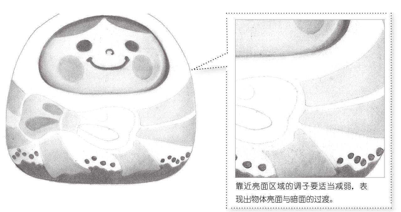 套娃的外观是几何体中的球体。绘制套娃的形体时,可以根据球体的明暗关系的变化规则进行绘制。根据光源的位置确定投影后,再进行描绘。