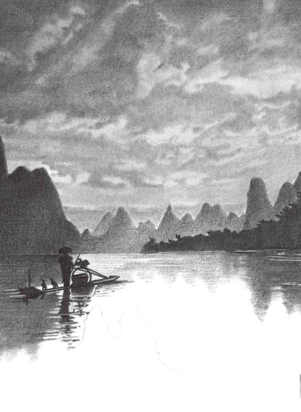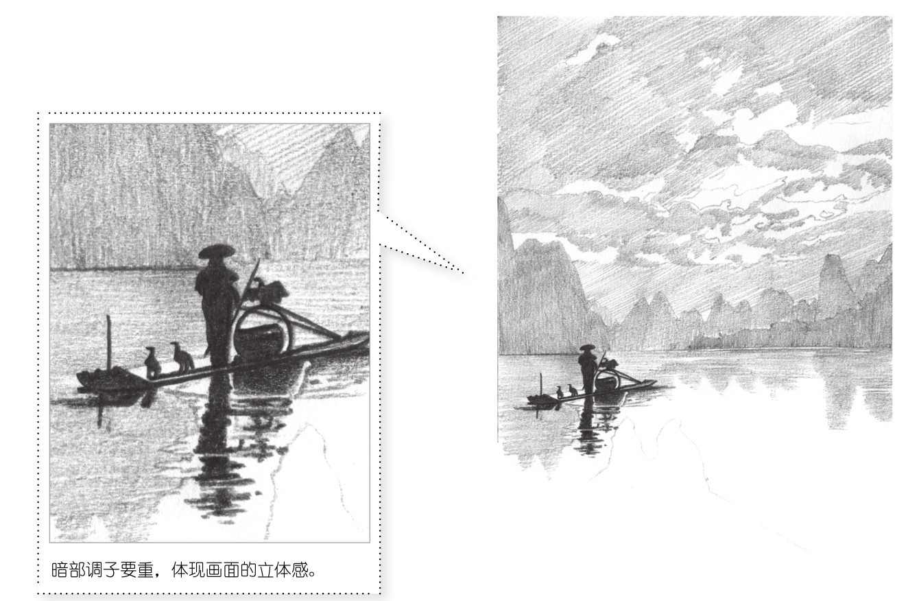 有山、有水的地方就像是人间仙境。山水风景的绘制综合了云彩、水面的绘制方法。刻画时应注意云彩质感与体积的表现,水面波纹与山峰倒影结合的形体位置。