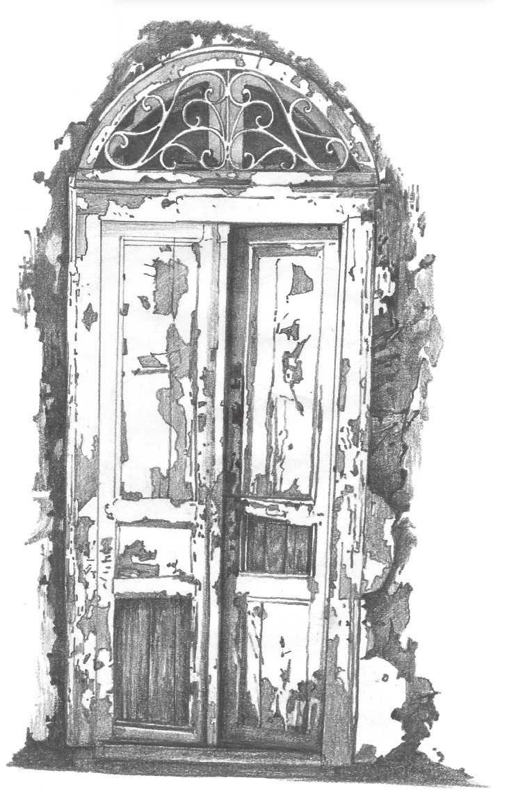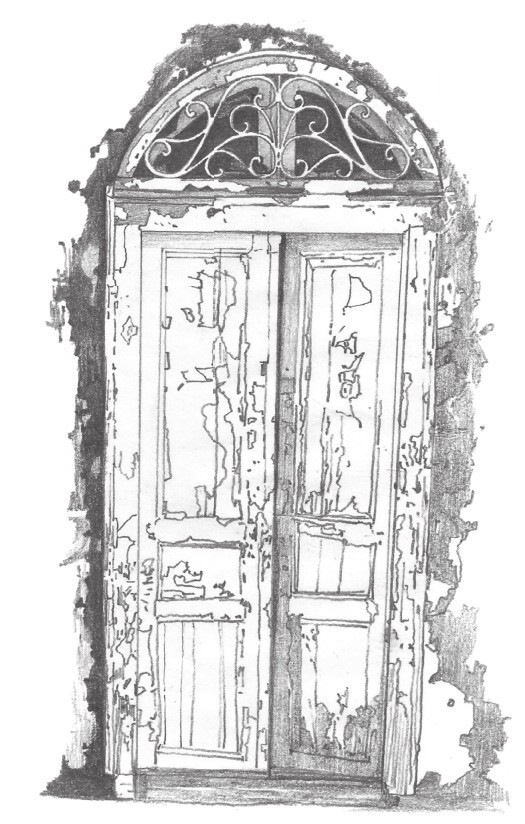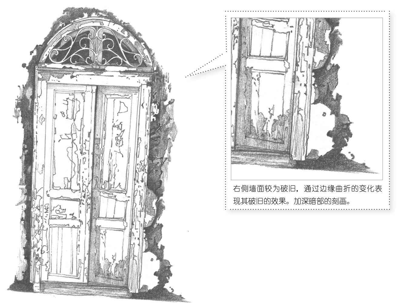 13 对木门左侧的亮部铺设一层简单的调子。用较硬的铅笔进行绘制。