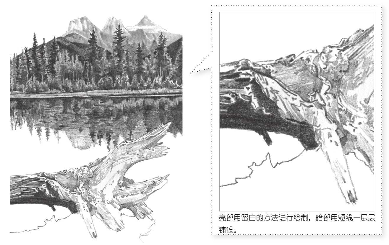 7 进一步绘制树木的暗部调子,细小变化的部分用较硬的铅笔进行刻画。