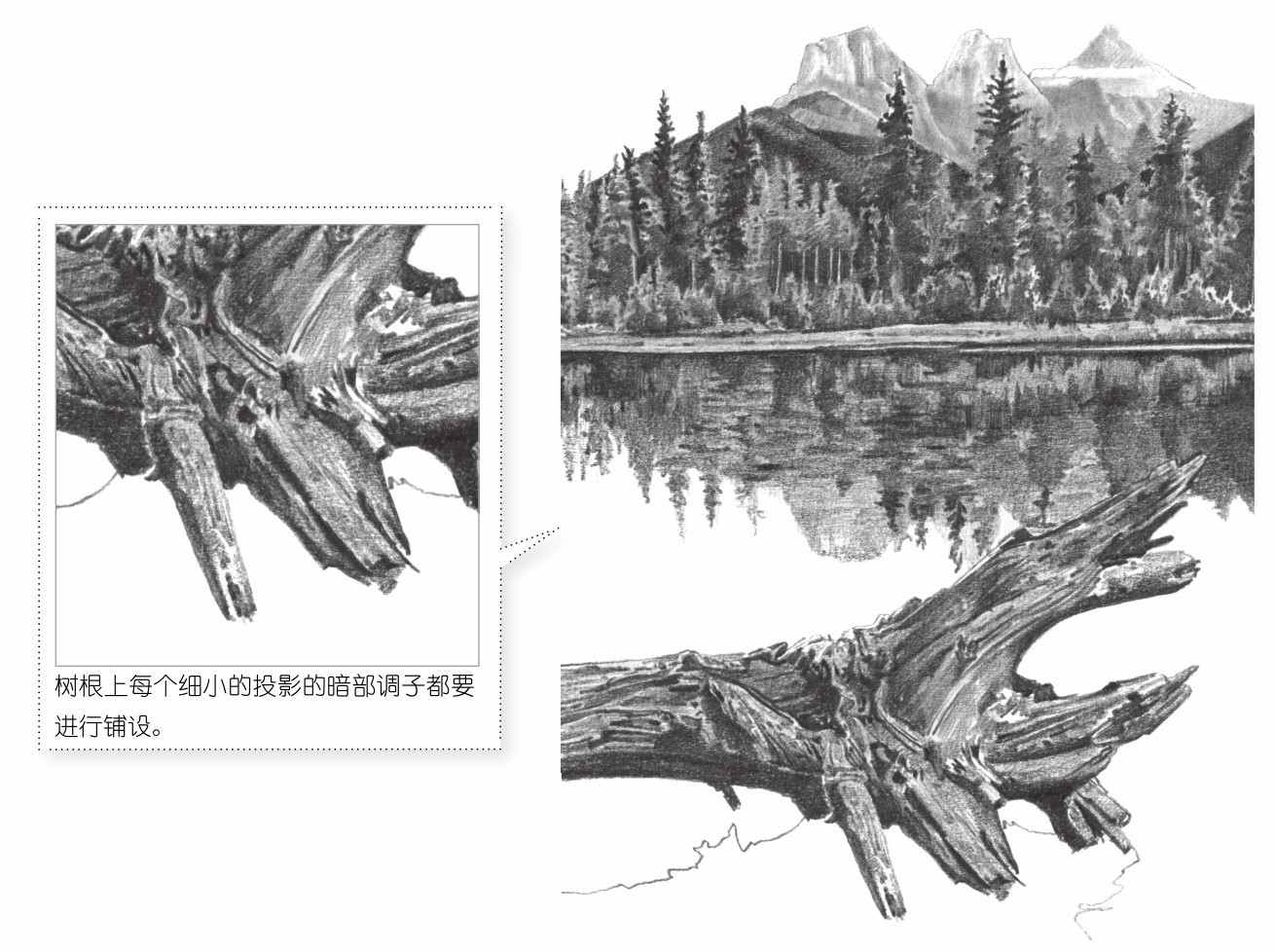 13 接着绘制树根位置的暗部调子,用较硬的铅笔绘制细小树纹的调子。