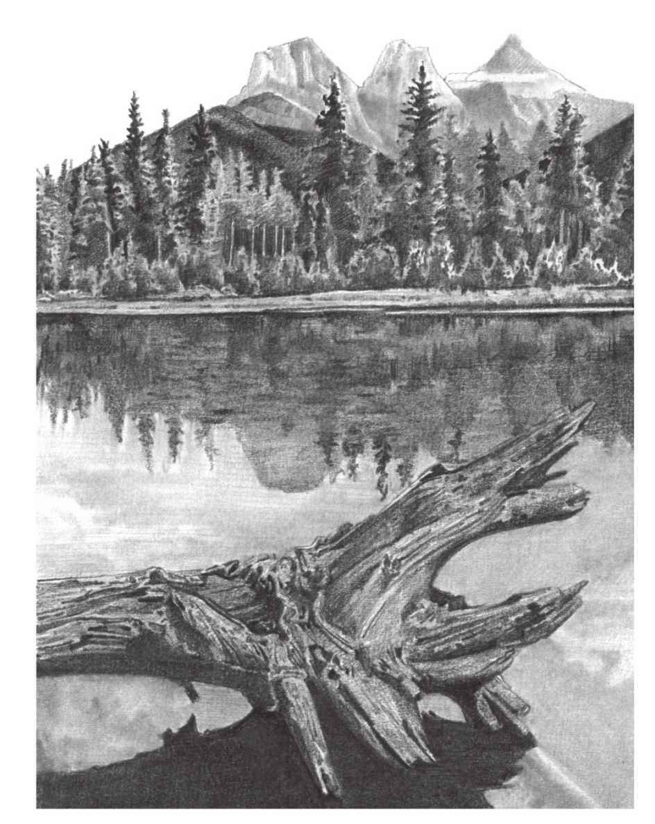 风景的绘制一般有远景和近景的绘制。这幅画的主体物是近景物的树根,要深入刻画树根处的调子,展现画面近实远虚的空间效果。