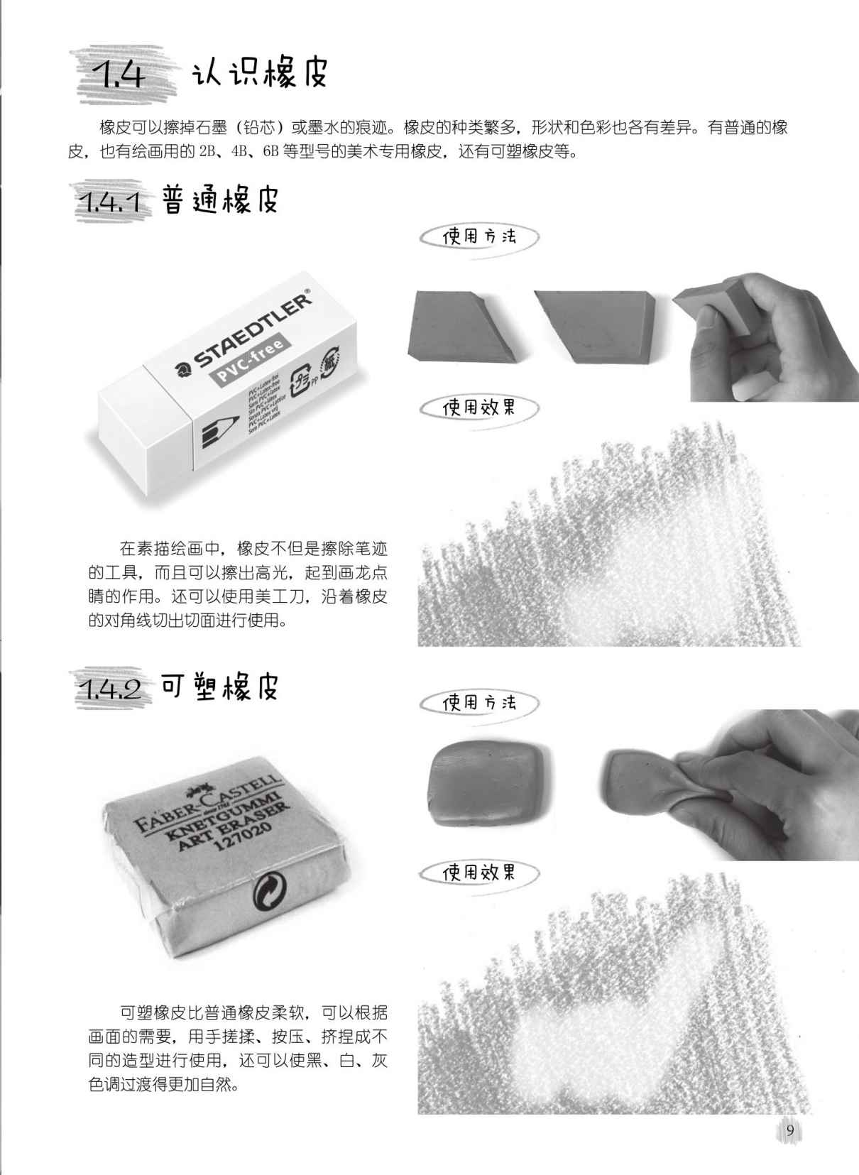 可塑橡皮比普通橡皮柔软,可以根据画面的需要,用手搓揉、按压、挤捏成不同的造型进行使用,还可以使黑、白、灰色调过渡得更加自然。