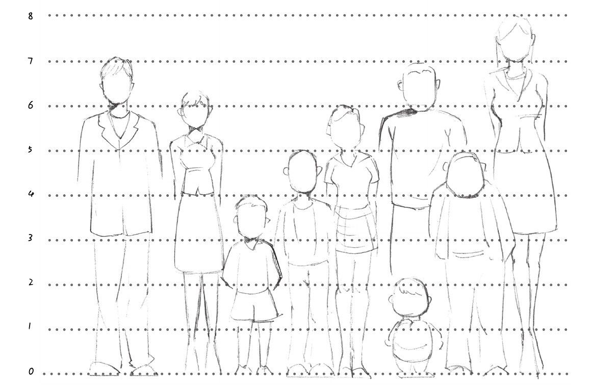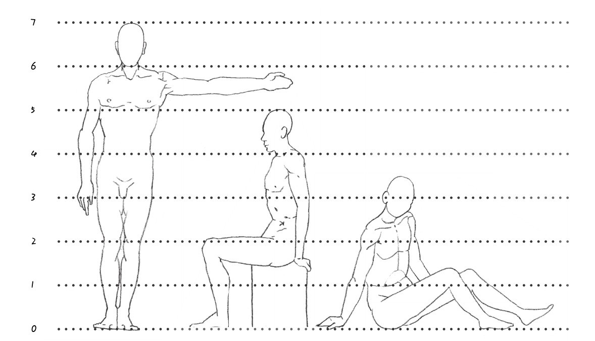 人体的比例一般以头长为单位,普通人体身高一般为7个头长,固有“站七、坐五、盘三半”的说法。绘画时要把握好这些人体的基本比例,准确的比例关系可以使人物看起来更加富有美感。