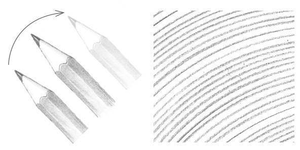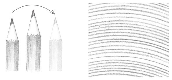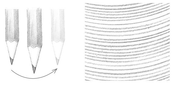 画素描一般不用平常写字的执笔方法,而用铅笔置于掌下的横握执笔方法。通过腕力与肘力的发挥,画出的线条平直、流畅,显得格外有力。绘画中常常需要通过握笔杆的不同位置来改变笔触力度,笔杆握得越高,越好画出长而淡的线条;笔杆握得越低,越好画出短而深的线条。