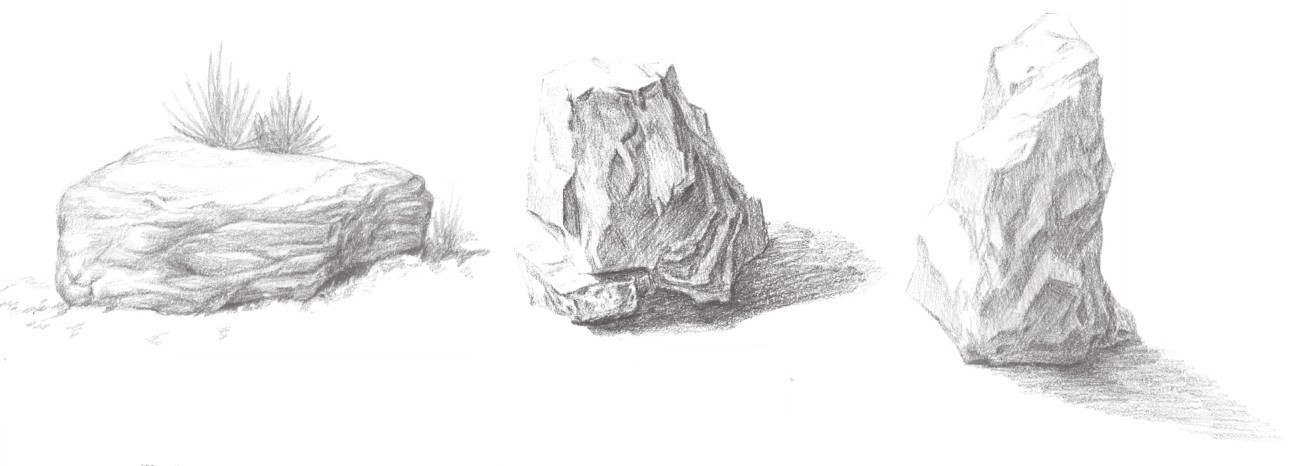 山石是风景素描中常见的陆地自然景观。自然界中的所有物体,都是依循其必然性生成的。要想把山石画得惟妙惟肖,最重要的还是要把握它的构造。这就需要在平时多注意观察现实中山石的形象,或多画些速写,积累素材。