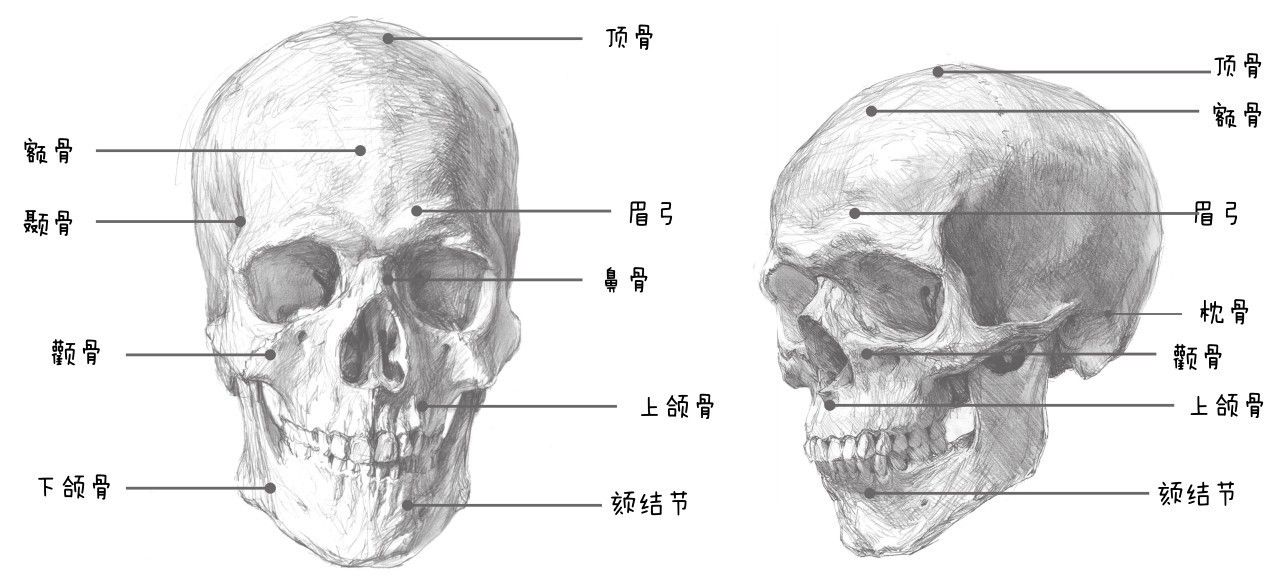 头骨由脑颅骨骼和面颅骨骼构成,额骨、顶骨、颞骨、枕骨等构成坚固的球形脑颅骨骼,鼻骨、颧骨、上颌骨、下颌骨等构成面颅骨骼,其中只有下颌骨是可以活动的。头部骨骼的形态与细节都会在头部外形上显露出来,并决定了头部的形体特征,从而成为素描造型的依据。