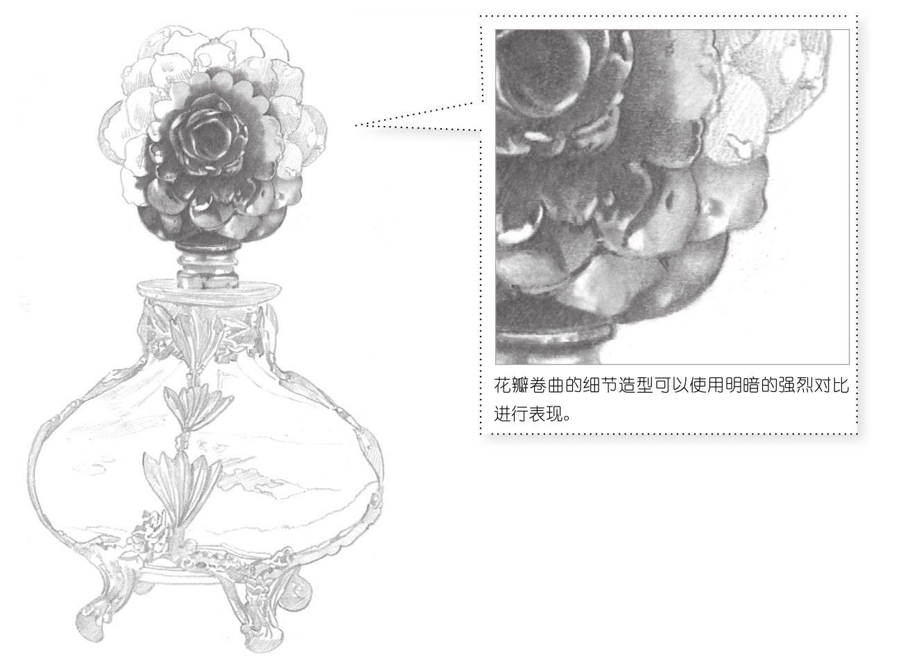 6 继续对花瓣的暗部调子进行刻画,底部与瓶口连接处有明显的高光区域,注意其形状的绘制。