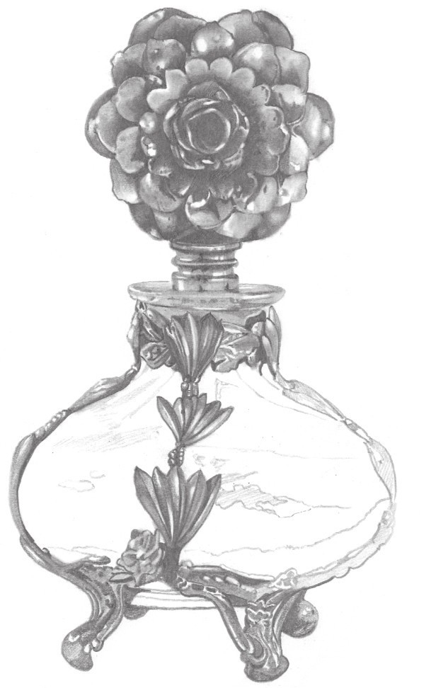 复古香水瓶造型独特,瓶口有漂亮的花朵装饰,瓶身上还有精致的花边装饰。刻画时要细致地画出装饰细节的造型图案,增强画面的表现力。