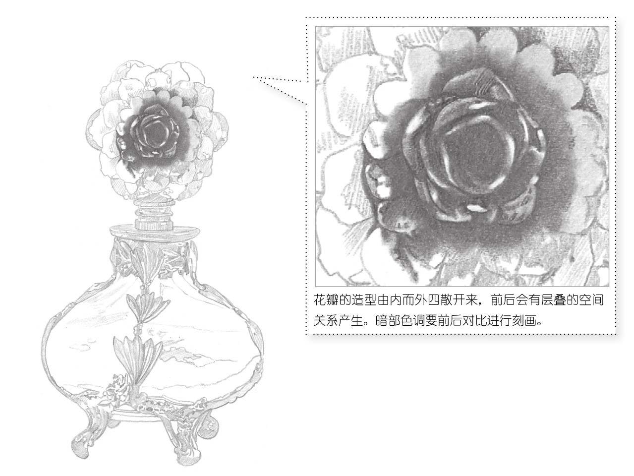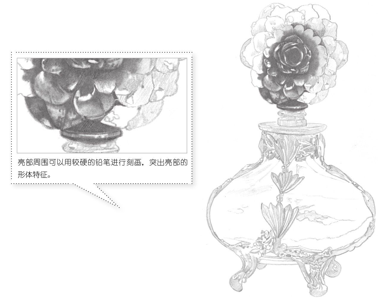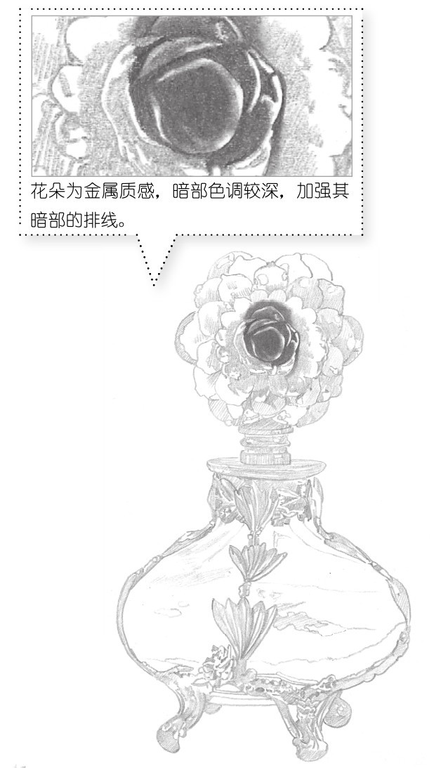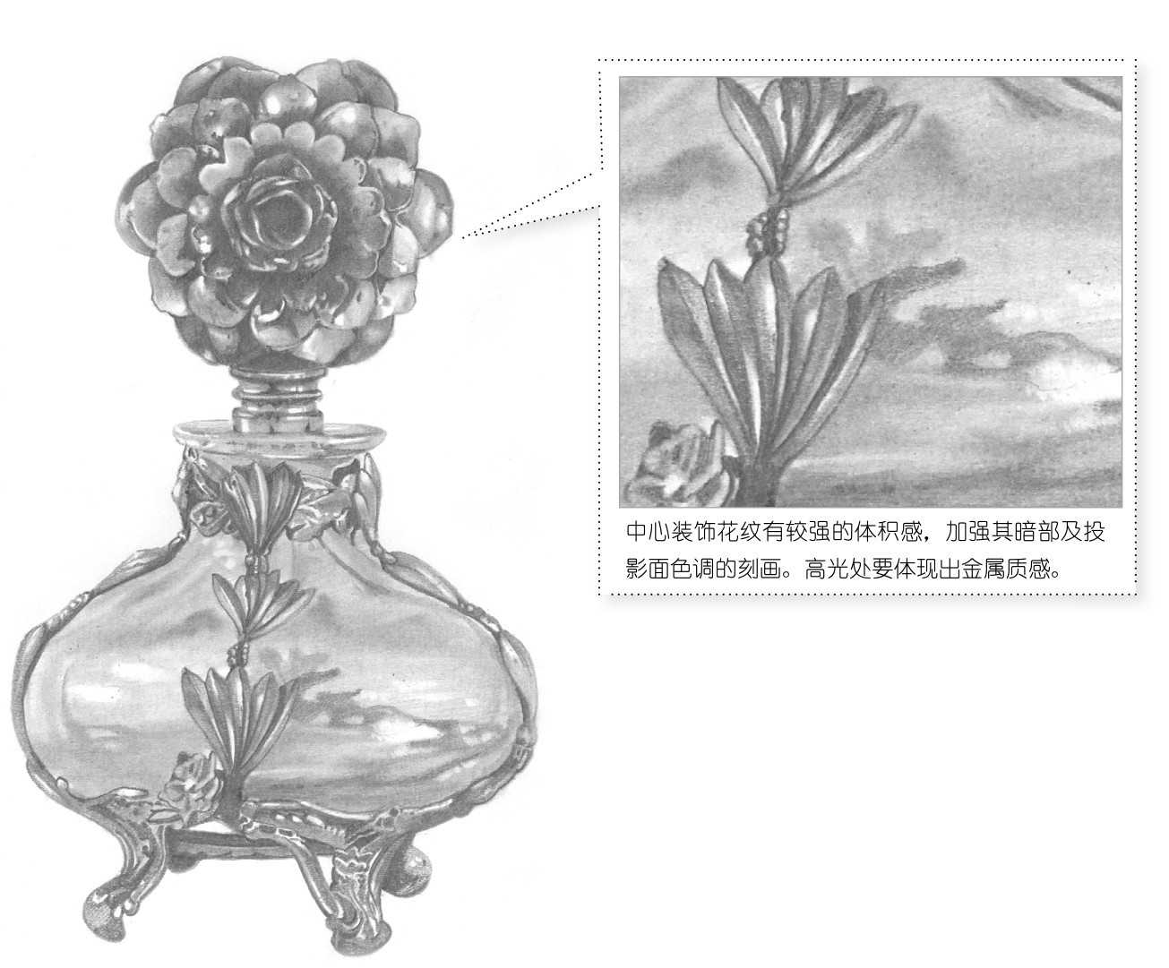 9 接着向下进行刻画,瓶身周围有金属花纹装饰物环绕,细致描绘其造型样式,并区分出明暗关系。