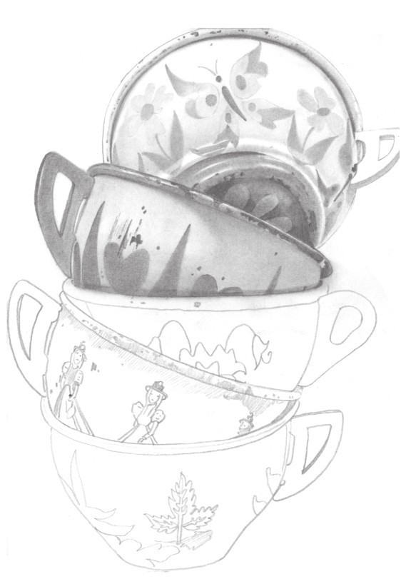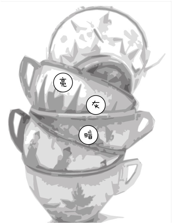 将大小、形体相同的茶杯上下层叠地摆放,形成了别致的造型。刻画时要把握好各个茶杯的形体样式以及茶杯之间的位置关系。