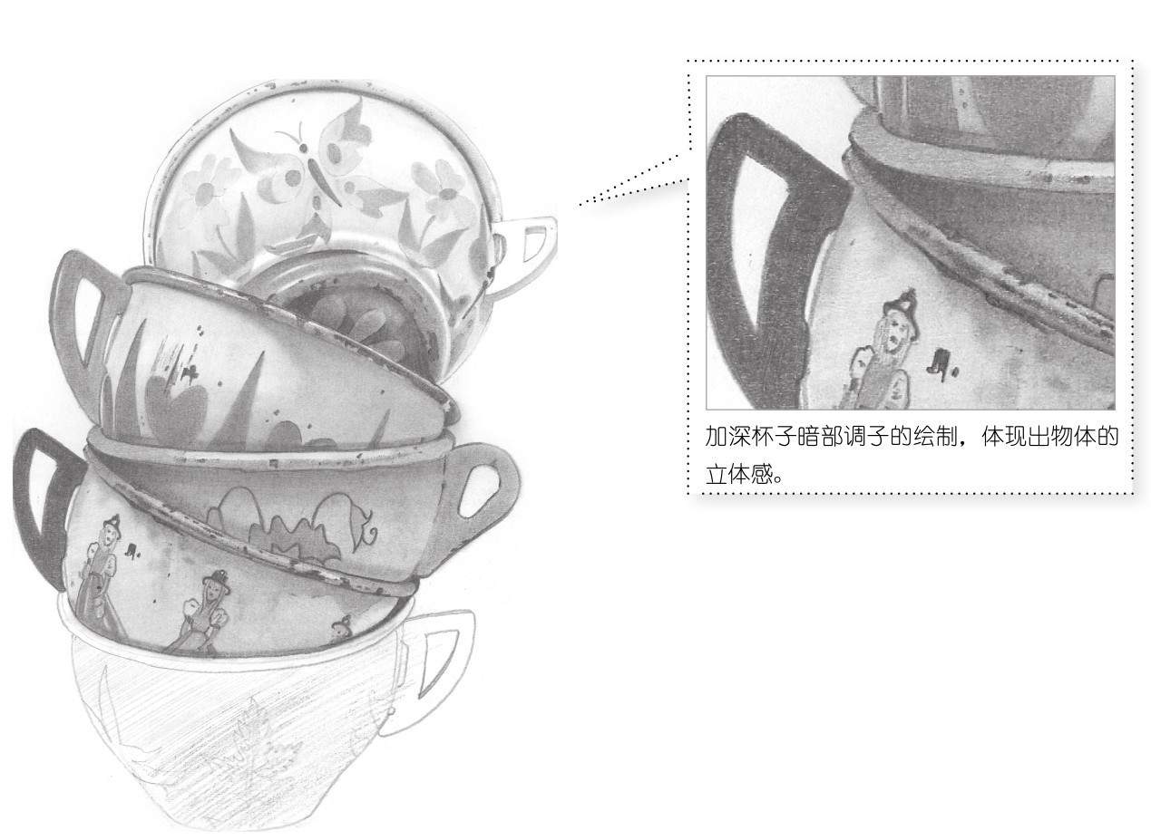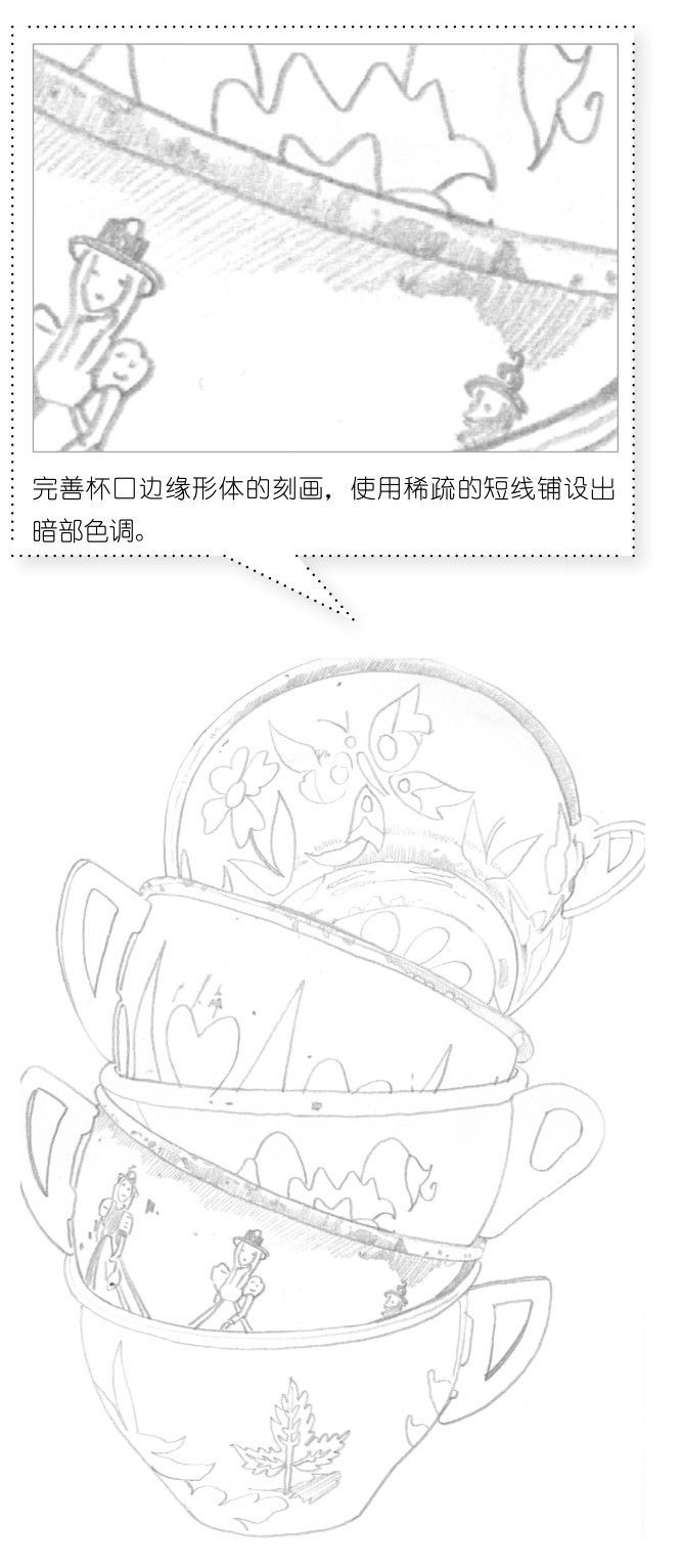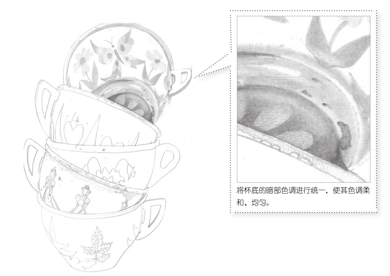 12 然后绘制底部上端茶杯杯身的暗部调子,此茶杯花纹图案复杂,用较硬的铅笔绘制。
