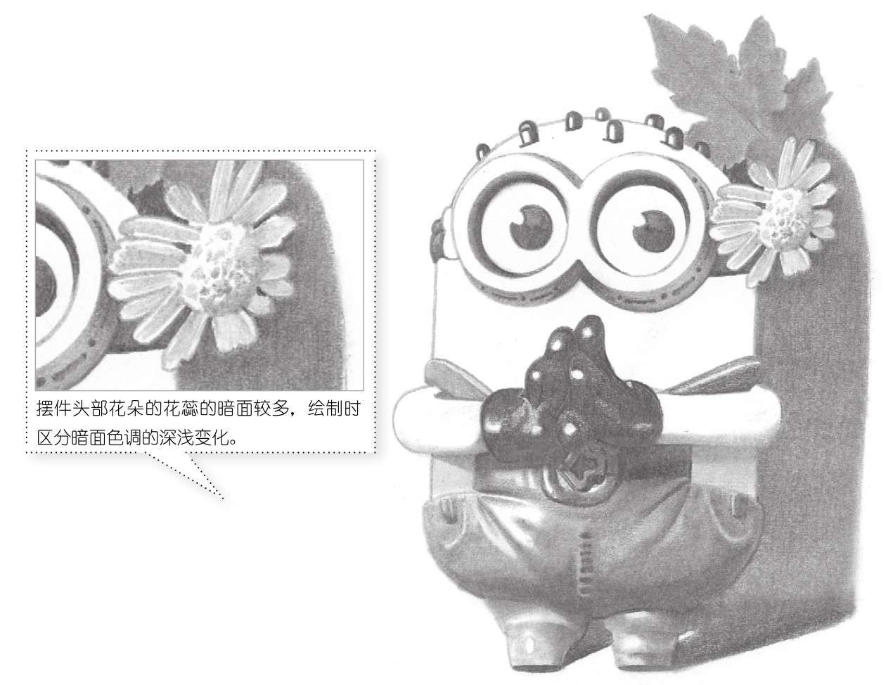 10 将摆件头部花朵的暗部调子绘制出来,然后用细密的线条加强摆件投影暗部的调子。